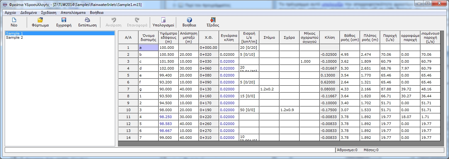 Το πρόγραμμα αυτό υπολογίζει την απορροφητικότητα φρεατίων υδροσυλλογής τύπου σχάρας, στομίου, σχάρας & στομίου και σχαρωτών αγωγών που υπάρχουν μεμονωμένα ή όλα μαζί σε κάθε διατομή μίας ή περισσοτέρων τάφρων οδών.