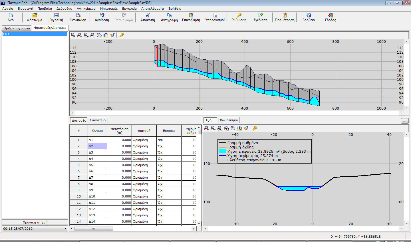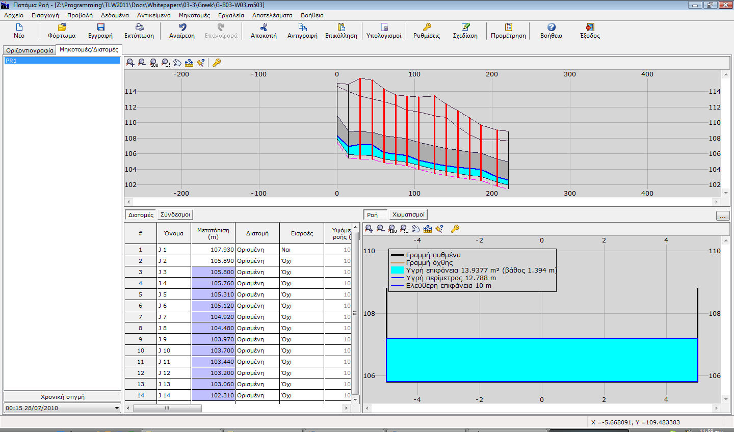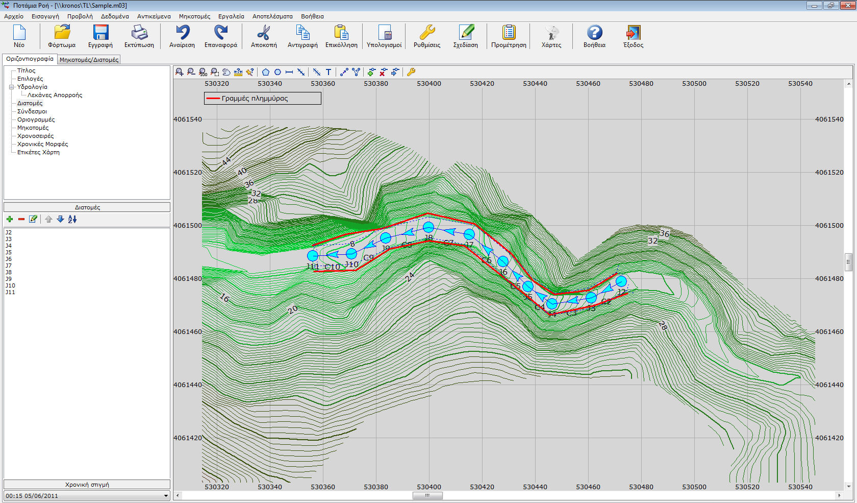Το πρόγραμμα αυτό υπολογίζει τις γραμμές πλημμύρας ποταμού ή ρέματος. Μπορείτε προαιρετικά να εισάγετε ισοϋψείς από DXF (και να υπολογίσετε αυτόματα τις διατομές), να εισάγετε τις συντεταγμένες της κοίτης του ρέματος από αρχείο DXF/GIS/GPS/GRD και να εξάγετε τα αποτελέσματα σε φορμά DXF/GIS/GPS. Μπορείτε επίσης να ορίσετε γραφικά ή αναλυτικά τις οριογραμμές. Παράγονται τα ακόλουθα σχέδια: Οριζοντιογραφία με γραμμές πλημμύρας και πίνακα συντεταγμένων οριογραμμών, μηκοτομή του ποταμού, διατομές με στάθμη νερού. Μπορείτε να χρησιμοποιήσετε ομοιόμορφη ή ανομοιόμορφη ανάλυση (κινηματικό και δυναμικό κύμα). Με δεδομένες τις ισοϋψείς και τις παροχές σχεδιασμού, η δημιουργία και η πλήρης επίλυση μιας μελέτης είναι υπόθεση λίγων λεπτών.