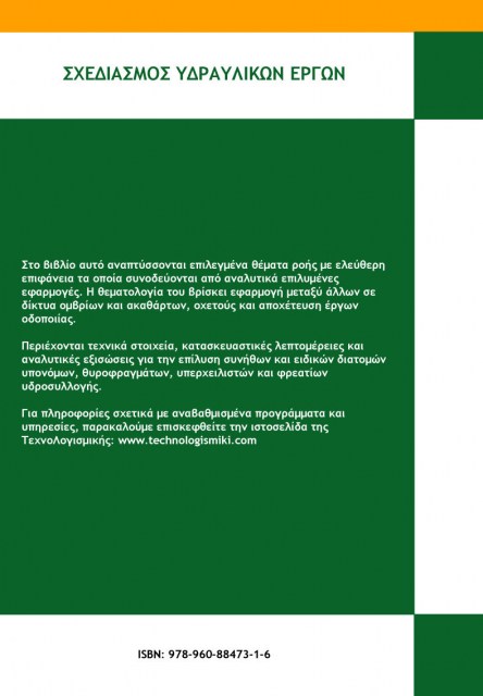 Αναπτύσσονται επιλεγμένα θέματα ροής με ελεύθερη επιφάνεια τα οποία συνοδεύονται από αναλυτικά επιλυμένες εφαρμογές. Η θεματολογία του βρίσκει εφαρμογή μεταξύ άλλων σε δίκτυα ομβρίων και ακαθάρτων, οχετούς και αποχέτευση έργων οδοποιίας.