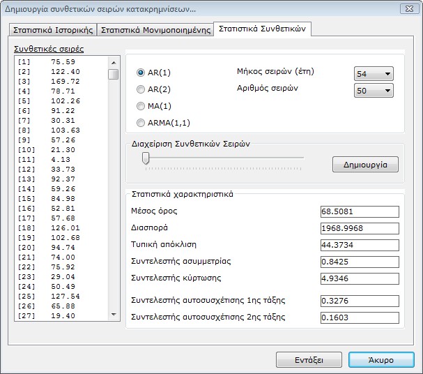 • Δυνατότητα δημιουργίας συνθετικών χρονοσειρών κατακρημνίσεων και θερμοκρασιών κρατώντας σταθερά κάποια στατιστικά χαρακτηριστικά των αντίστοιχων ιστορικών χρονοσειρών. Τα υποστηριζόμενα στοχαστικά μοντέλα είναι τα: