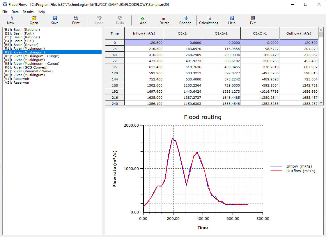 This program calculates the flood flow in water basins caused by rainfall, flood routing in rivers and reservoirs. For the calculation of the flood flows in water basins, the Rational method or other empirical formulas may be used. The concentration time is used in the IDF curve to calculate the rainfall intensity. The use of the above formulas is restricted by certain conditions. The program notifies the user in case one or more formulas are out of scope and should not be used. For flood routing in reservoirs the Storage Indicator method is used.