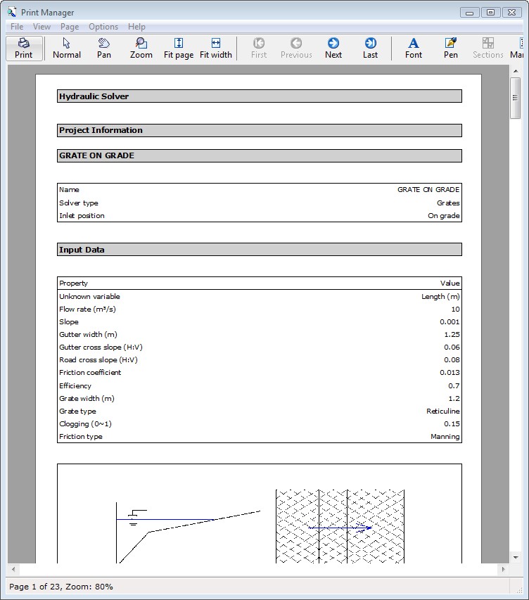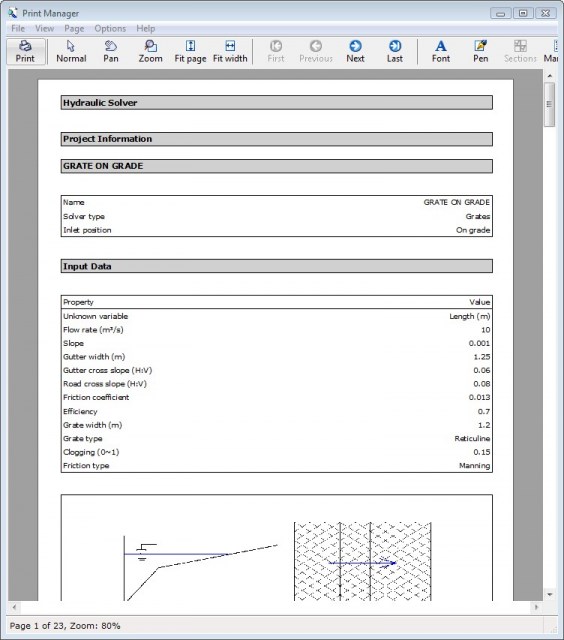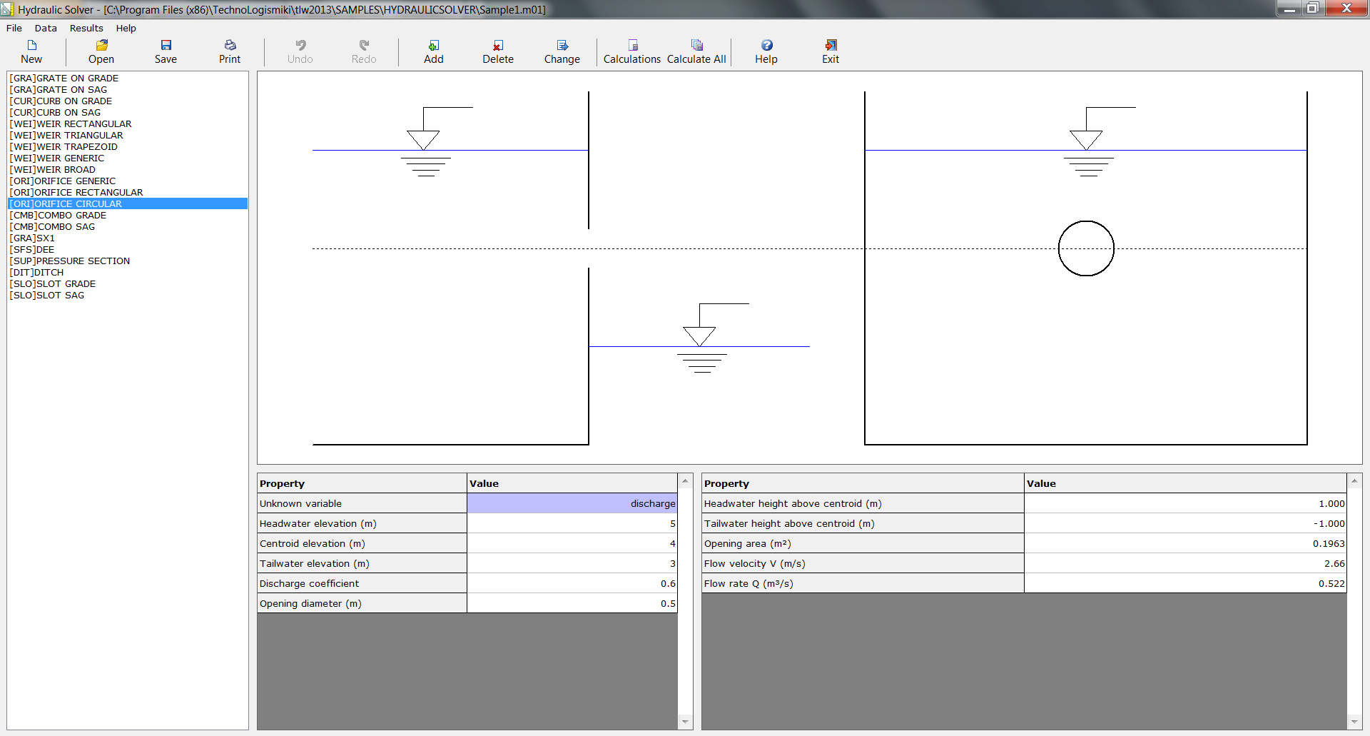 Hydraulic Solver allows the calculation of flow problems in: sections with free surface, sections under pressure, orifices, weirs, grates, curbs, combination inlets, ditches, slots, pumps, reaction turbines, impulse turbines and hydropower pumps. Each solver may have an unknown variable which is selected by the user. For example, sections with free surface may have the flow depth or the flow rate as the unknown variable, among others.