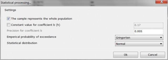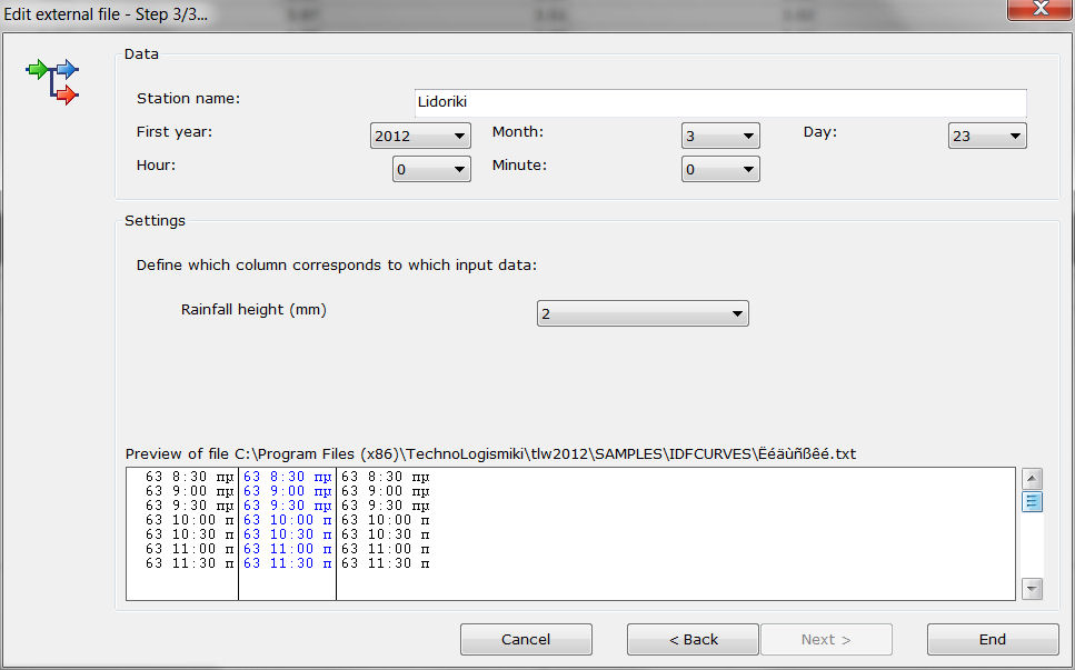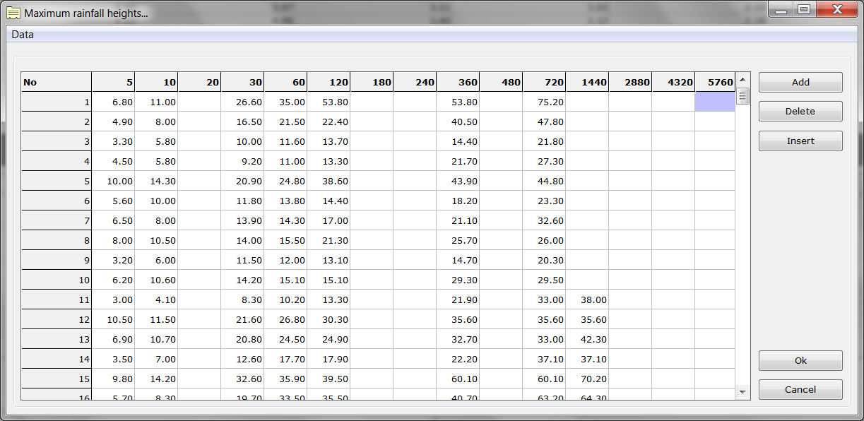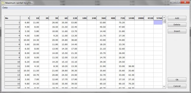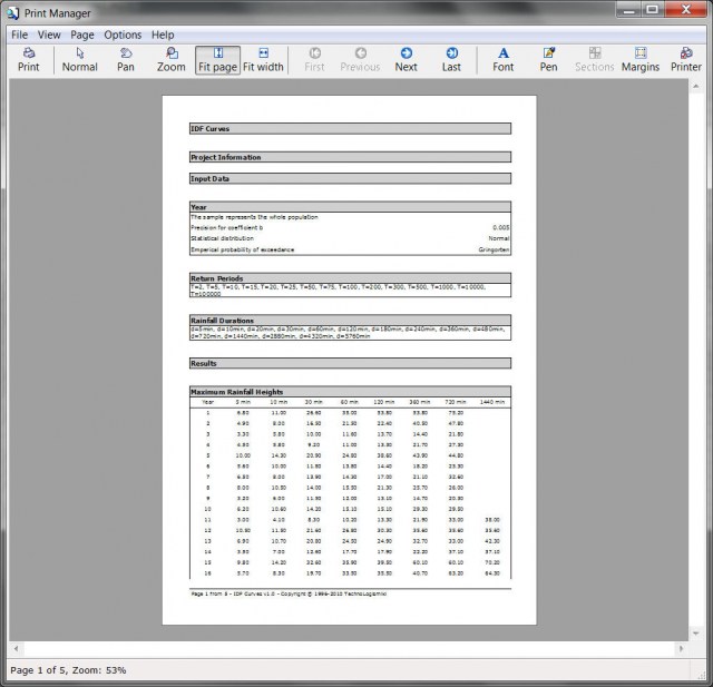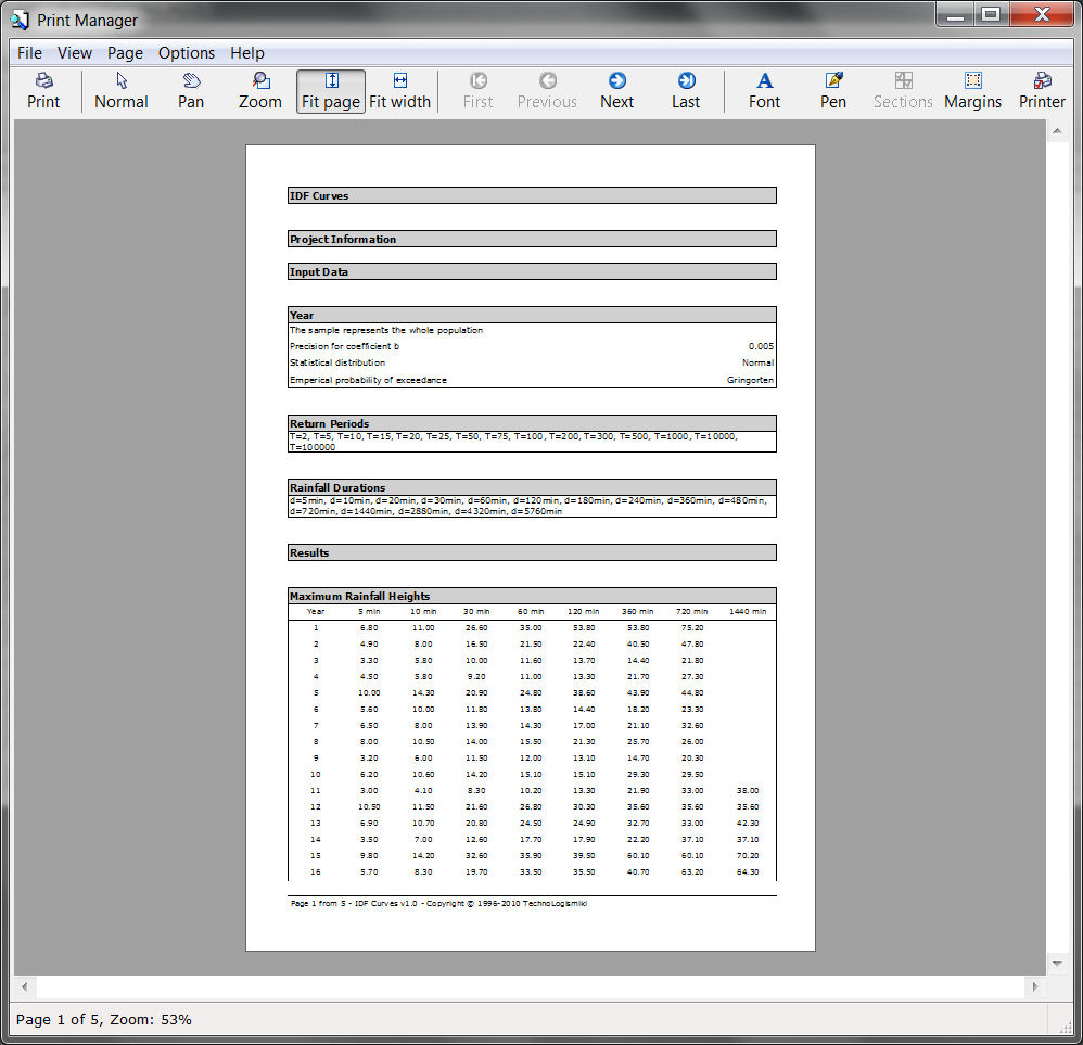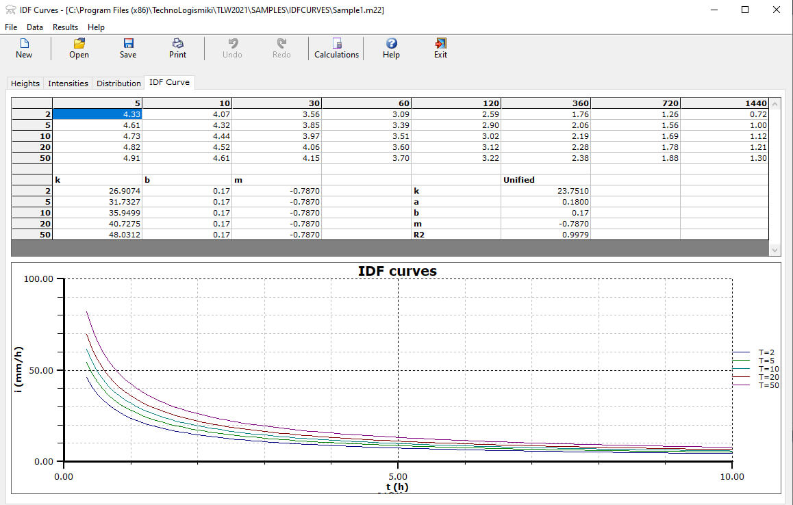 This program creates rainfall intensity - duration - frequency curves, also known as IDF curves. The equation of the IDF curves is i=kTa/(t+b)m. The user can either utilize unprocessed data from one or more rain gages or processed time series given as maximum annual rainfall heights per rainfall duration.