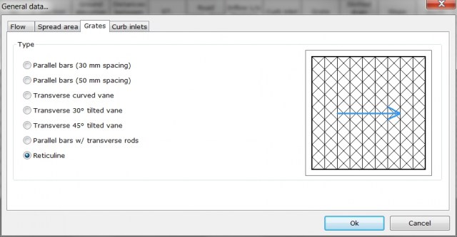 Grates can be one of 7 predefined forms: Parallel bars (30 mm and 50 mm spacing), Transverse curved vane, Transverse 30 deg tilted vane, Transverse 45 deg tilted vane, Parallel bars with transverse rods, Reticuline.