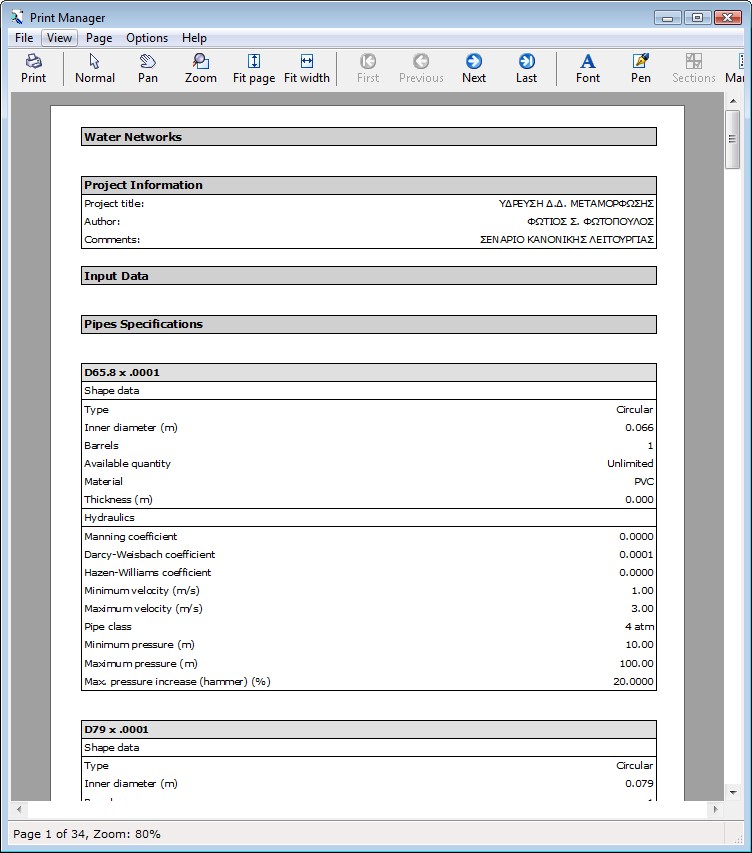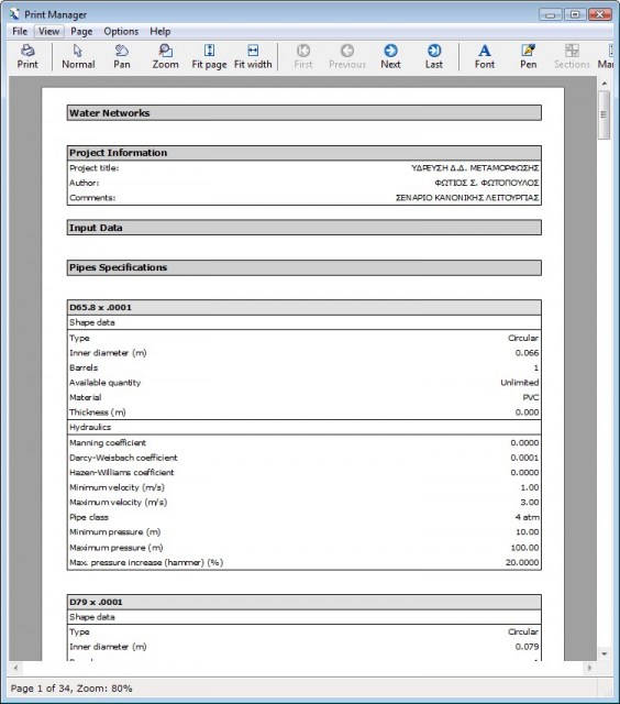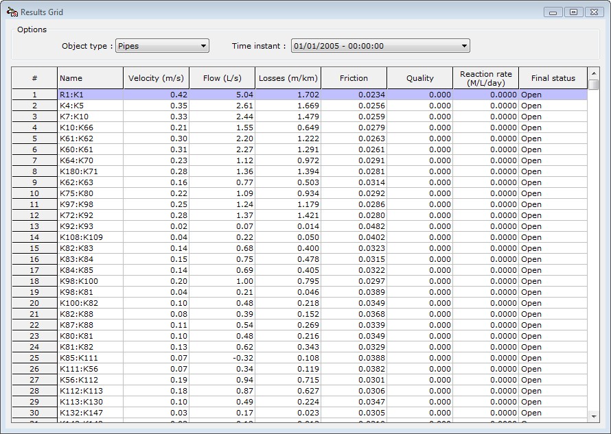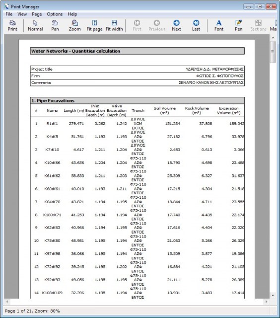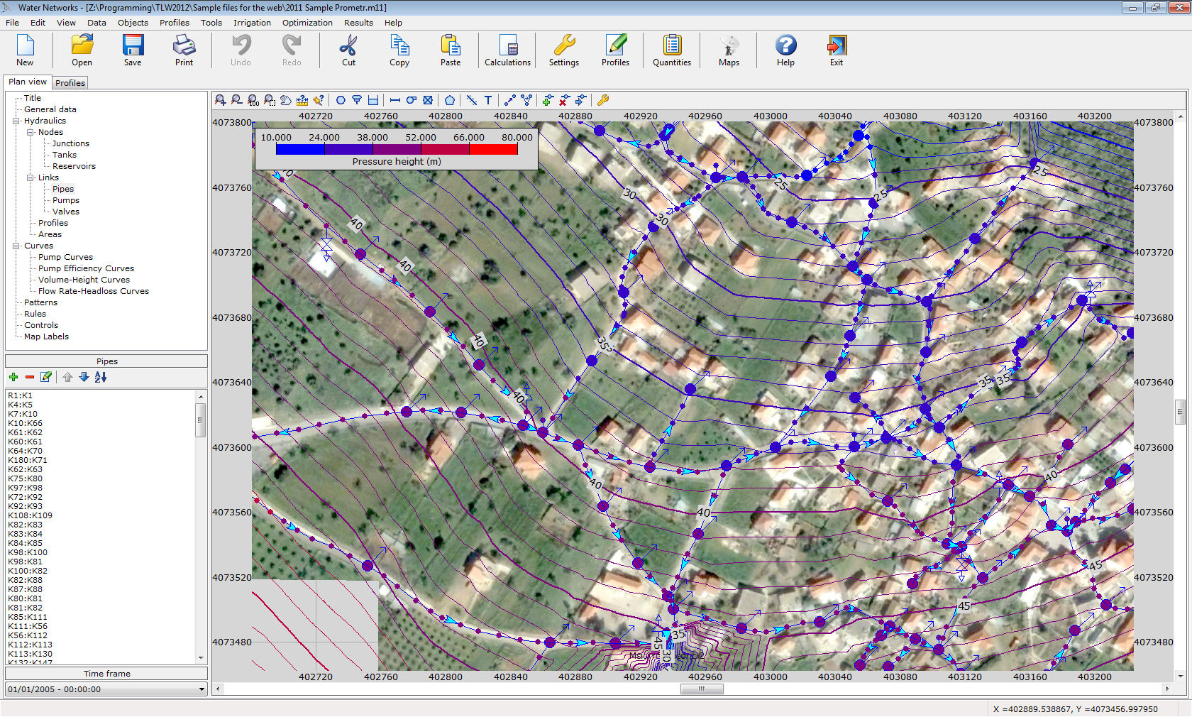 This program solves water and irrigation networks, i.e. networks under pressure. The energy losses along the pipes are calculated based on one of the following friction formulas: Manning, Darcy-Weisbach or Hazen-Williams. Apart from hydraulic analysis, water quality analysis can also be performed. The program can be used for single or extended period analyses. The network may contain any number of objects, i.e. nodes, pipes, tanks, reservoirs, valves, hydrants, pumps, air release valves and vacuum valves. The profile drawings can be created with one click.