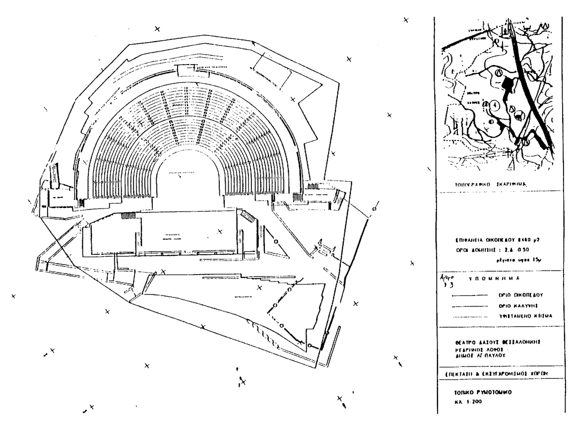 Εντός του παραπάνω χώρου καθορίζεται θέση και διάταξη των εγκαταστάσεων θεάτρου και των βοηθητικών του κτισμάτων, όπως φαίνεται με κόκκινη γραμμή στο ίδιο διάγραμμα.