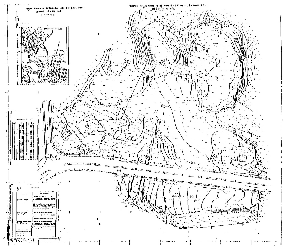 Εντός του παραπάνω χώρου καθορίζεται θέση και διάταξη υπαίθριου θεάτρου - καμαρινιών - γραφείων - αποθηκών, εργαστηρίων διασκευής και συντήρησης θεατρικού εξοπλισμού κτιρίων, χώρων υγιεινής, αναψυκτηρίου, εκδοτηρίου εισιτηρίων και δασαρχείου - παρατηρητηρίου, βιολογικού καθαρισμού και υποσταθμού Δημόσιας Επιχείρησης Ηλεκτρισμού - γεννήτριας, όπως φαίνεται με κόκκινες γραμμές και την ένδειξη 1 και 8, 4, 3, 9, 14, 10, 11 αντίστοιχα στο ίδιο διάγραμμα.