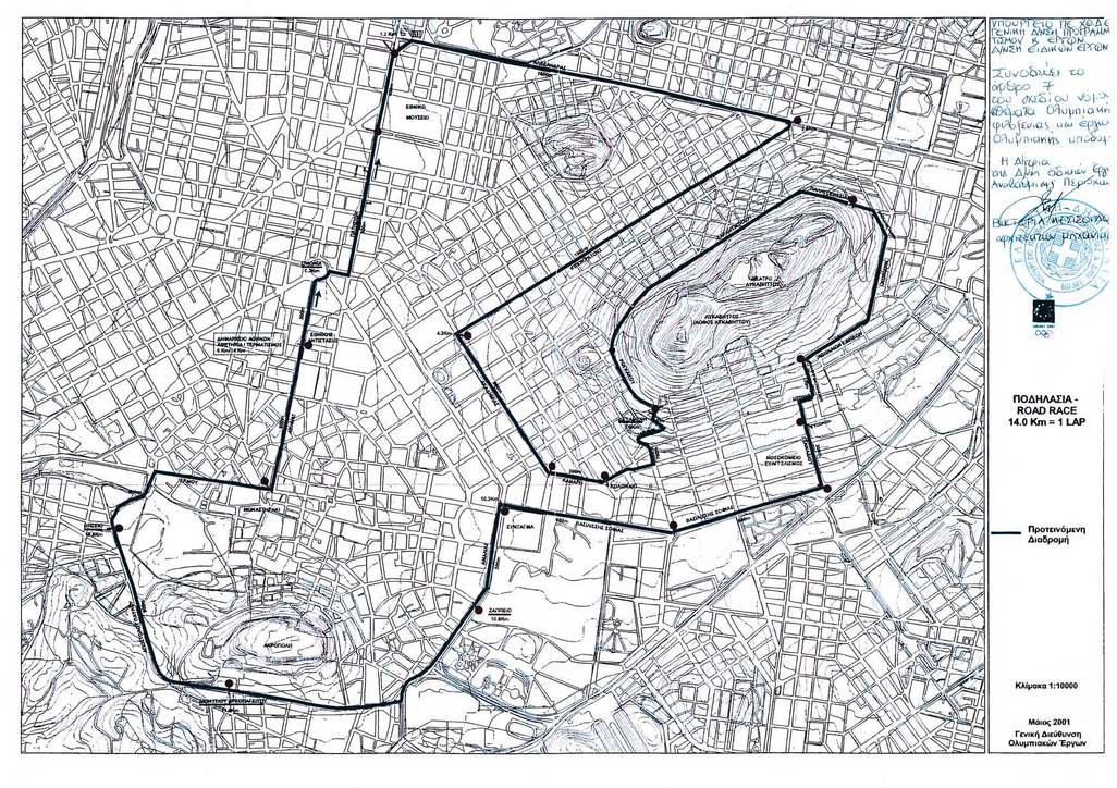 β)10. Η διαδρομή του ποδηλατικού αγώνα αντοχής στο Δήμο Αθηναίων, όπως αυτή αναλυτικά αναφέρεται κατωτέρω και απεικονίζεται σε διάγραμμα κλίμακας 1:10.000 που έχει θεωρηθεί από τον Προϊστάμενο της Διεύθυνσης Ειδικών Έργων Αναβάθμισης Περιοχών του Υπουργείου Περιβάλλοντος, Χωροταξίας και Δημόσιων Έργων και του οποίου αντίτυπο σε φωτοσμίκρυνση δημοσιεύεται με το νόμο αυτόν στην Εφημερίδα της Κυβερνήσεως: Αθηνάς (Δημαρχείο), πλατεία Ομονοίας, Πατησίων, Λεωφόρο Αλεξάνδρας, Ιπποκράτους, Κανάρη, Πατριάρχου Ιωακείμ, Ηροδότου, Γλύκωνος, Ξανθίππου, Ρογκάκου, Σαρανταπήχου, Παλιγγενεσίας, Δασκαλογιάννη, Κόνιαρη, Αθηναίων Εφήβων, Αναπήρων Πολέμου, Σουδίας, Γενναδίου, Βασιλίσσης Σοφίας, Αμαλίας, Διονυσίου Αρεοπαγίτου, Αποστόλου Παύλου, Ερμού, Αθηνάς.