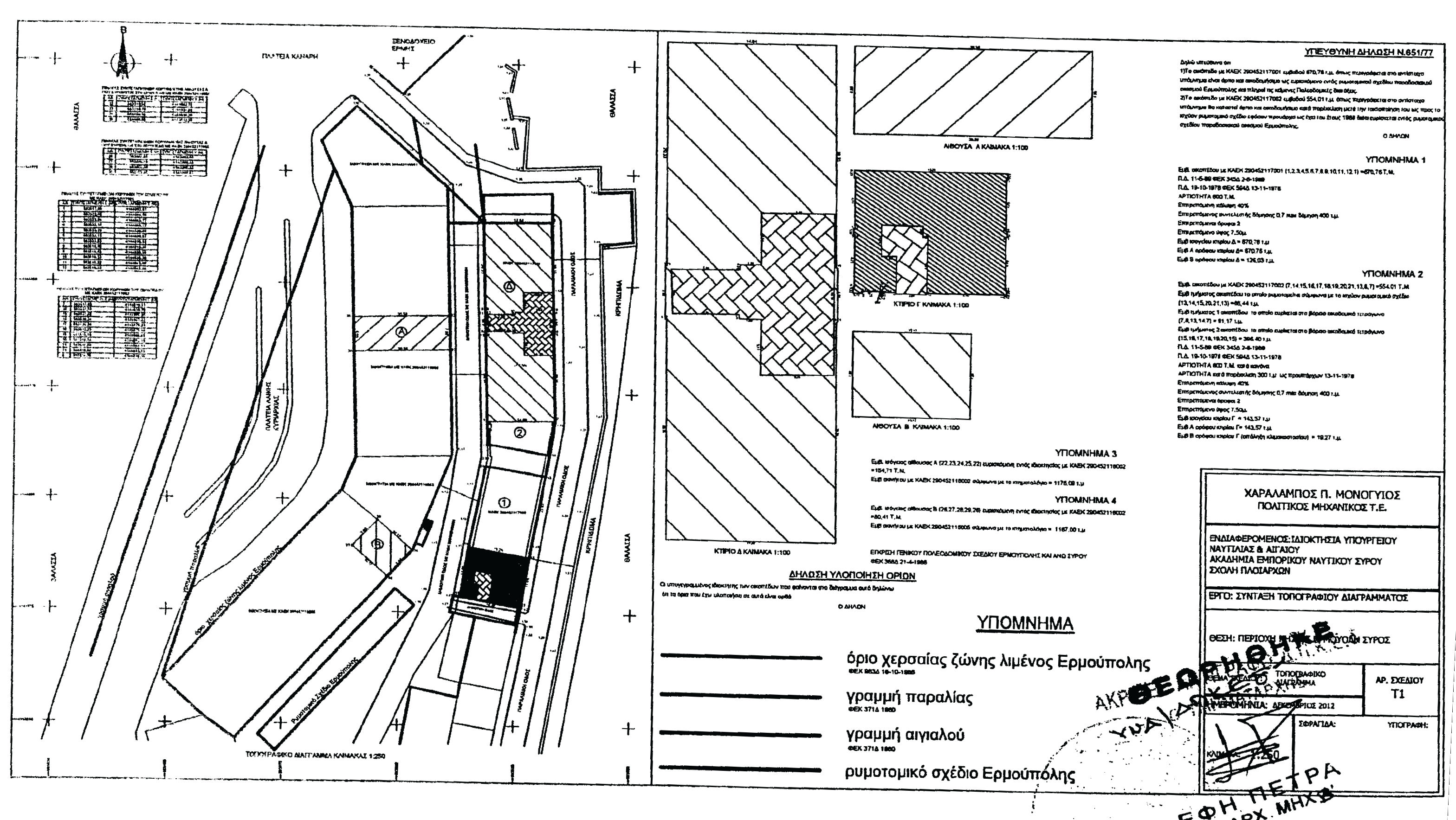 2. Χαρακτηρίζεται νομίμως υφιστάμενο κατά θέση, χρήση και δόμηση, το κτίριο Διοικητηρίου Ακαδημίας Εμπορικού Ναυτικού Σύρου υπό στοιχεία κάτοψης (16 - 17 - 18 - 19 - 16), ευρισκόμενο εντός του ρυμοτομικού σχεδίου Ερμούπολης και εκτός αιγιαλού, παραλίας και εκτός χερσαίας ζώνης λιμένα, ως έχει, επί συνολικής οικοπεδικής έκτασης των εγκαταστάσεων 1.224,77 τετραγωνικά μέτρα όπως αυτή ορίζεται από τα στοιχεία (1 - 2 - 3 - 4 - 5 - 6 - 7 - 8 - 9 - 10 - 11 - 13 - 14 - 15 - 16 - 17 - 18 - 19 - 20 - 21 - 13 - 8 - 9 - 10 - 11 - 12 - 1), όπως απεικονίζονται στο υπό κλίμακα 1:250 από το Δεκέμβριο 2012 τοπογραφικό διάγραμμα πολιτικού μηχανικού Τεχνολογικής Εκπαίδευσης Μονογιού Χαράλαμπου, θεωρημένο από την αρμόδια Διεύθυνση Προμηθειών και Κτιριακών Εγκαταστάσεων τμήμα δ' (κτιριακών εγκαταστάσεων) του Υπουργείου Ναυτιλίας και Αιγαίου, το οποίο σε φωτοσμίκρυνση δημοσιεύεται με τον παρόντα νόμο (Παράρτημα 2) με συνολική κάλυψη κτιρίου 143,57 m2 και συνολική δόμηση 287,14 m2.