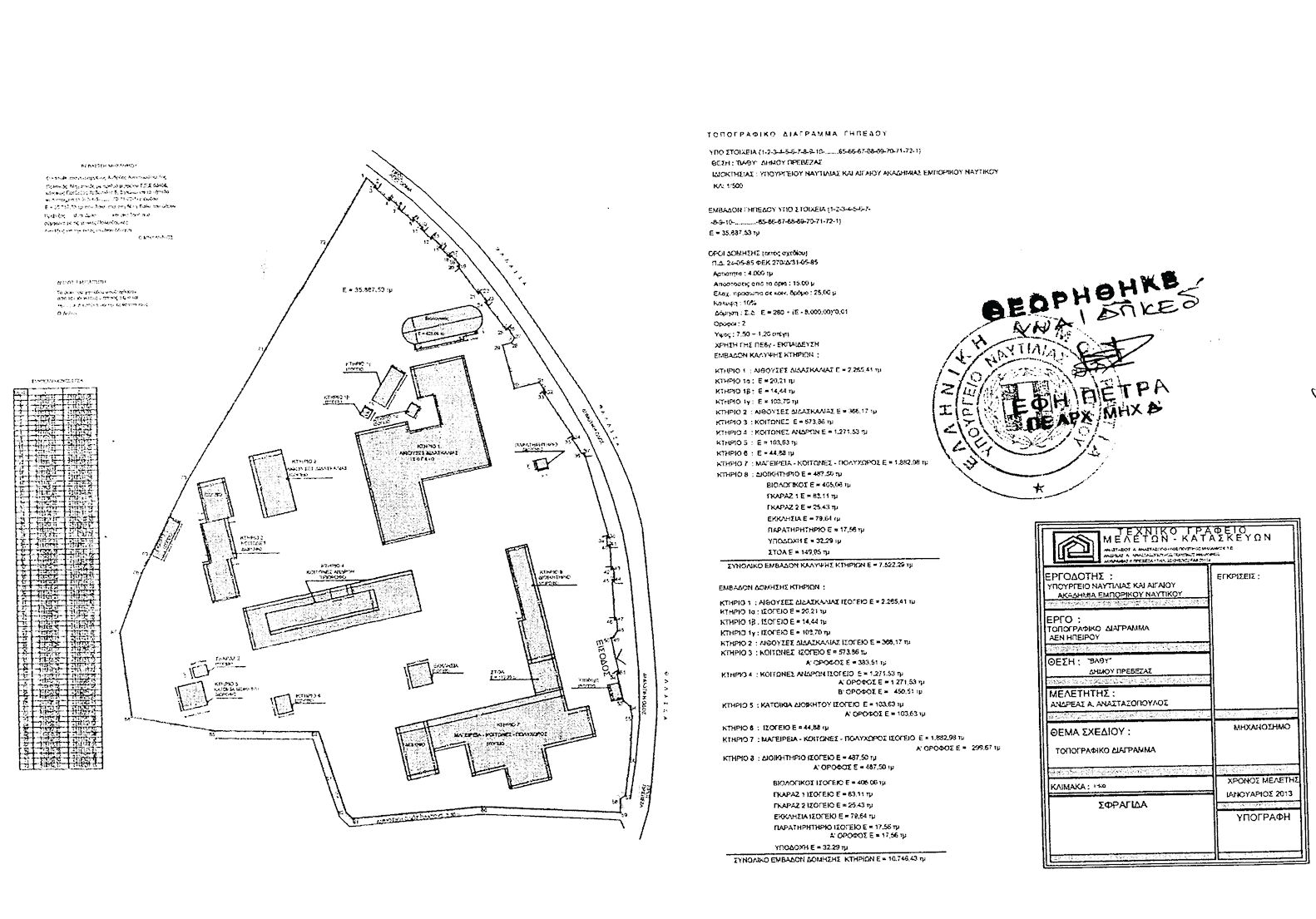 1. α. Χαρακτηρίζονται νομίμως υφιστάμενα κατά θέση, χρήση και δόμηση, το σύνολο των εγκαταστάσεων των κτιρίων της Ακαδημίας Εμπορικού Ναυτικού Ασπροπύργου ως έχει, επί συνολικής οικοπεδικής έκτασης των εγκαταστάσεων 58.962,35 τετραγωνικά μέτρα όπως αυτή ορίζεται από τα στοιχεία (1 - 2 - 3 - 4 - 5 - 6 - 7 - 48 -8 - 9 - 10 - 11 - 12 - 13 - 14 - 15 - 16 - 17 - 18 - 19 - 20 -21 - 22 - 23 - 24 - 25 - 26 - 27 - 28 - 29 - 30 - 31 - 32 -32 - 33 - 34 - 35 - 36 - 37 - 38 - 39 - 40 - 41 - 42 - 43 -1), αποτελούμενη από το εκτός χερσαίας ζώνης λιμένα τμήμα, υπό τα στοιχεία (1 - 2 - 3 - 4 - 5 - 6 - 7 - 48- 47 - 46 - 45 - 44 - 30 - 31 - 32 - 32 - 33 - 34 - 35 - 36 -37 - 38 - 39 - 40 - 41 - 42 - 43 - 1) έκτασης 46.280,50 τετραγωνικά μέτρα και το εντός χερσαίας ζώνης λιμένα, υπό τα στοιχεία (48 - 8 - 9 - 10 - 11 - 12 - 13 - 14 - 15 - 16 - 17 - 18 - 19 - 20 - 21 - 22 - 23 - 24 - 25 - 26 - 27 - 28 - 29 - 30 - 44 - 45 - 46 - 47 - 48) έκτασης 12.681,85 m2, όπως απεικονίζονται στο υπό κλίμακα 1:500 από το Φεβρουάριο του 2013 τοπογραφικό διάγραμμα του πολιτικού μηχανικού Χριστόφιλου Γεωργίου, θεωρημένο από την αρμόδια Διεύθυνση Προμηθειών και Κτιριακών Εγκαταστάσεων τμήμα δ' (κτιριακών εγκαταστάσεων) του Υπουργείου Ναυτιλίας και Αιγαίου, το οποίο σε φωτοσμίκρυνση δημοσιεύεται με τον παρόντα νόμο (Παράρτημα 1) με συνολική κάλυψη κτιριακών εγκαταστάσεων 10.277,94 m2 και συνολική δόμηση 17.699,71 m2.